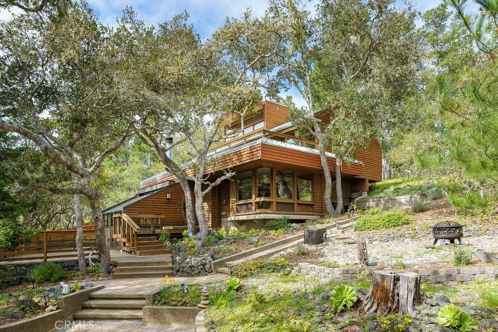 1021 Hillcrest is an architectural gem, perfectly designed for the 1+ acre site in sunny and sought after Pine Knolls, the original premier neighborhood in the seaside village of Cambria. This home features a passive solar design that incorporates Big Sur-esque exposed aggregate walls that serve as thermal mass complimenting the Douglas Fir post/beam structure. While the spaces are multi-leveled, only a few stairs separate each. Ceilings are vaulted and beamed, with skylights and windows for abundant light while feeling the outdoors mingle with your inside living. Decks provide plenty of outside living space where you can take in the awesome setting, which is not only adjacent to the approx 1,600 acre Covell Ranch, but also provides ocean views and powerful sunsets to the west! James Maul, noted Central Coast architect, designed so many features into this property, with paths and patios connecting the main home to the guest house, and the detached garage just below. The buildings are set back from the street, up the beautifully multicolored paver driveway, with extra parking areas, including RV area with hookups. The main house is loft-style one bedroom with great openness throughout, and the guest house has 2 bedrooms and a bath, also designed Maul-style with plenty of artful beam work. The two parcels total over one acre of privacy and unlimited options for your legacy property. A few minutes from the village, and a short drive to Big Sur, Paso Robles wine country, many beaches to meet your needs, and our big city of San Luis Obispo!! Call your realtor today for a private showing.