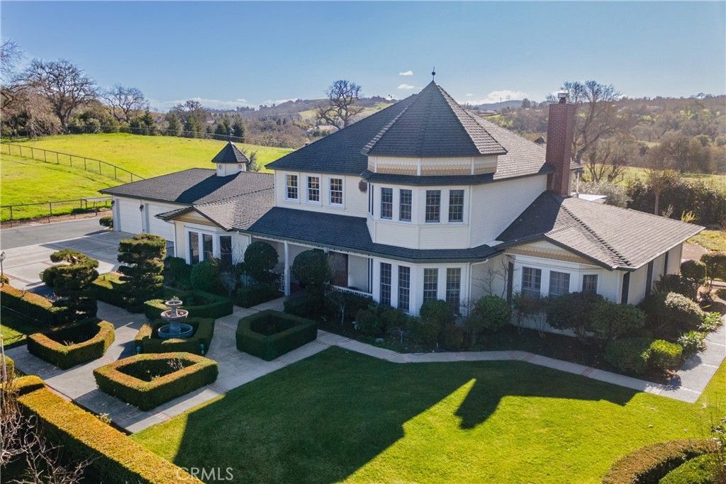 You must see this stunning Country Ranch home with lovely views in each direction in a highly desirable neighborhood. This distinctive Spanish Camp beauty on almost 5 acres is located just outside the city limits of Paso Robles. Nestled in the heart of this prized community you will find more of what your heart seeks than almost anywhere. The 4 bedroom plus office home of 3930 square feet has a primary bedroom and office downstairs plus 3 bedrooms upstairs one of which is en suite. From the marble tiled entry with sweeping staircase to mahogany cabinetry and woodwork throughout this classic home to the Vermont slate floors and native rock wall fireplace, you will be delighted with the attention to detail in this 1988 built home. This horse ready property will delight any equestrian with its 4 stall barn, tack room, and storage garage for an 4 additional vehicles. Steel pipe fencing surrounds the acreage and is used as cross fencing for the pastures. It also encompasses a riding arena of approximately 230' X 100' with a raised viewing stand. This arena would please any ranch or dressage rider. Or perhaps you need a private soccer field? And for those who love a summertime party, the covered patio which overlooks the 75 X 17 lap pool is ready for fun and exercise. The land includes an olive orchard of over 30 trees as well as an organic pomegranate orchard with over 50 bushes. There are raised garden beds, fruit trees and grape vines planted throughout this lovely property. An owned solar system and on demand hot water unit help with utility costs. This property is designed to be lived in, lived on and loved for all it has to offer. So much to see and experience. Homes of this quality rarely hit the market. Now is your chance to buy a property that is ready and waiting to answer your dreams. Call us now to view this dream come true.