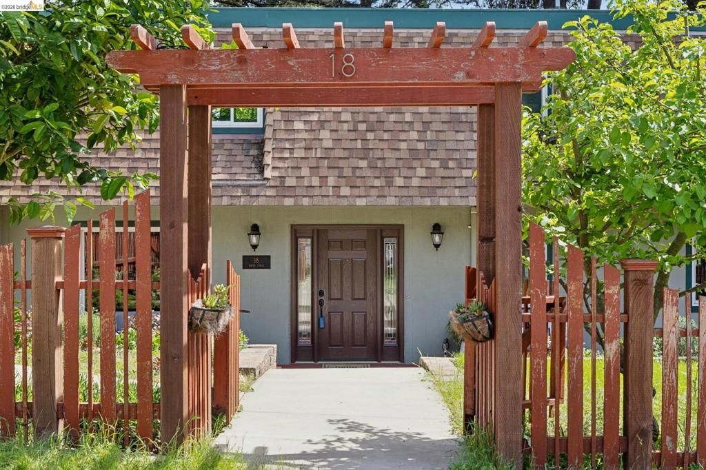 18 North Circle is a rarity in the Oakland Hills. Its situation on a large, mostly level cul-de-sac, as well as a level front yard with charming picket fence make it feel quite traditional for a hills house. The living room has a fireplace and direct access to the wrap-around deck for outdoor living. The eat-in kitchen is oversized with a large island, a pantry, and windows on three sides to let in the light. The primary bedroom has an updated marble bathroom with step-in shower and a walk-in closet. Three more bedrooms offers great flexibility. The side yard is terraced and ready for your kitchen garden, while the backyard has a patio and delightful play structure. There are contemporary upgrades like air conditioning and a tankless water heater, and extra parking for your camper or RV. Just up the street from the Hills Swim and Tennis Club, this is your tranquil home in the hills.