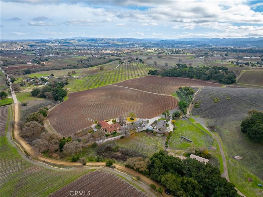 This exquisite 163.33 +/- acre, two parcel property is a gem nestled in the sought-after Paso Robles' Westside. Live Oak Vineyards graces the renowned Paso Robles Willow Creek AVA, surrounded by esteemed wineries and picturesque vineyards, presenting an unparalleled estate and vineyard prospect. The terrain is gently rolling, offering breathtaking panoramic views, while the 65.49 +/- acre vineyard consistently yields some of the region's finest wines. Comprising Chardonnay, Viognier, Cabernet Franc, Cabernet Sauvignon, and Petite Verdot, this vineyard is contracted with leading wineries on the Central Coast. The grandeur of the custom-built Main Home Estate unfolds with impeccable design and meticulous craftsmanship evident from the moment you step inside. Boasting 3,060 +/- sf, 2 bedrooms, 2 bathrooms, plus an office, this residence features an open and spacious floor plan with high open-beamed ceilings, wooden beams, ceramic tile, and hardwood flooring throughout. The chef's dream kitchen, complete with granite countertops, high-end appliances, a walk-around pantry, and a center island with bar seating, is ideal for entertaining. The living area, adorned with a beautiful wood-burning fireplace and built-in wood storage, creates a cozy ambiance on chilly evenings. The primary suite offers access to the back balcony, and the primary bathroom includes a walk-in closet, two vanities, a walk-in tile shower, and a wall gas stove. A covered breezeway leads from the kitchen to the 2-car garage, housing a finished, temperature-controlled wine storage room and a laundry room. The charming two-story barn-style guest house, built in 1981, spans 2,210 +/- sf with granite counters, wood cabinets, and hardwood flooring. The upper level comprises an open living area, kitchen, den, half bathroom, primary bedroom, and primary bathroom. Downstairs, the spacious garage area, utility room, half bathroom, and workroom provide additional functionality. Adjacent to the breezeway, guest quarters feature a living area, two bedrooms, and one three-quarter bathroom. A solar system covers both the main and guest homes and the domestic well, reducing energy costs. There are also 60 Arbequena Spanish Olive trees that produce great olive oil. Vineyards, mesmerizing views, a prime location, privacy, an estate home, a retreat?this property encapsulates it all. Seize the opportunity to own this extraordinary property today; it's a once-in-a-lifetime chance you won't want to miss!