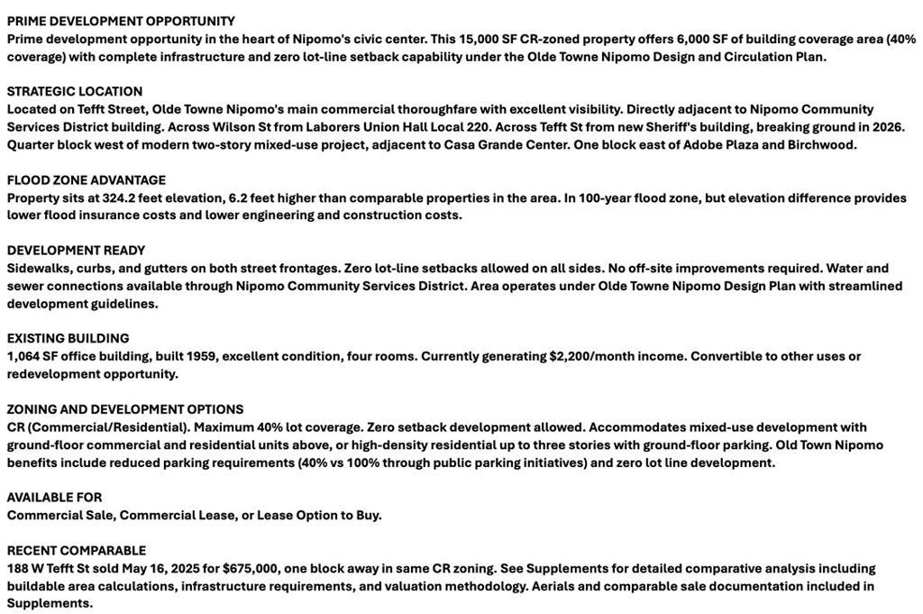 Video: https://cdn.muse.ai/u/kQXGNUX/823494b617fc2f642a5acd92a50f4babf79463a782c3bc5b93978b493c735b65/videos/video.mp4 Property is also listed in Land as MLS # SC25281902 PRIME DEVELOPMENT OPPORTUNITY Prime development opportunity in the heart of Nipomo's civic center. This 15,000 SF CR-zoned property offers 6,000 SF of building coverage area (40% coverage) with complete infrastructure and zero lot-line setback capability under the Olde Towne Nipomo Design and Circulation Plan. STRATEGIC LOCATION Located on Tefft Street, Olde Towne Nipomo's main commercial thoroughfare with excellent visibility. Directly adjacent to Nipomo Community Services District building. Across Wilson St from Laborers Union Hall Local 220. Across Tefft St from new Sheriff's building, breaking ground in 2026. Quarter block west of modern two-story mixed-use project, adjacent to Casa Grande Center. One block east of Adobe Plaza and Birchwood. FLOOD ZONE ADVANTAGE Property sits at 324.2 feet elevation, 6.2 feet higher than comparable properties in the area. In 100-year flood zone, but elevation difference provides lower flood insurance costs and lower engineering and construction costs. DEVELOPMENT READY Sidewalks, curbs, and gutters on both street frontages. Zero lot-line setbacks allowed on all sides. No off-site improvements required. Water and sewer connections available through Nipomo Community Services District. Area operates under Olde Towne Nipomo Design Plan with streamlined development guidelines. EXISTING BUILDING 1,064 SF office building, built 1959, excellent condition, four rooms. Currently generating $2,200/month income. Convertible to other uses or redevelopment opportunity. ZONING AND DEVELOPMENT OPTIONS CR (Commercial/Residential). Maximum 40% lot coverage. Zero setback development allowed. Accommodates mixed-use development with ground-floor commercial and residential units above, or high-density residential up to three stories with ground-floor parking. Old Town Nipomo benefits include reduced parking requirements (40% vs 100% through public parking initiatives) and zero lot line development. AVAILABLE FOR Commercial Sale, Commercial Lease, or Lease Option to Buy. RECENT COMPARABLE 188 W Tefft St sold May 16, 2025 for $675,000, one block away in same CR zoning. See Supplements for detailed comparative analysis including buildable area calculations, infrastructure requirements, and valuation methodology