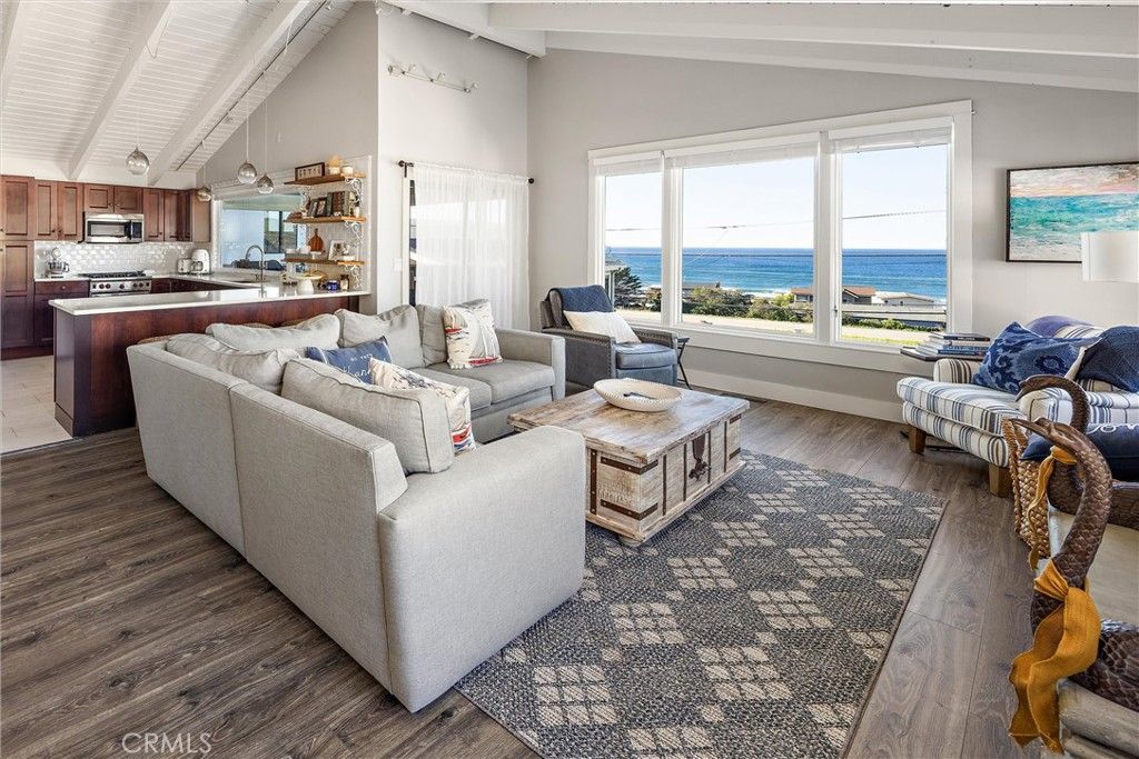 Hillside Haven with the benefit of a short term rental license and spacious floorplan. This lovely Cayucos home provides sweeping coastal views and is situated on a quiet neighborhood street used mostly by local traffic. The 2-car garage is fronted by a wide drive for off-street parking. Stone accents highlight the front. A split entry offers hillside views, and the ocean peeks over nearby houses. The main living area is a half flight up with skylight above soaring ceilings and a massive hearth. Theres a handy wet bar too! Windows and deck supply wide coastal views above the rooflines below. The kitchen has generous size and ample storage with quality appliances, cabinetry and fixtures. A generous dining area has a guest bath nearby and china storage. The outside deck area serves for viewing, but is large enough for dining. Downstairs, the primary suite boasts a shower and tub, plus more generous storage. The lower level has a total of 3 bedrooms, 2 spacious bathrooms and outside access. Spacious design, fine views, and lots of use options. See it soon.