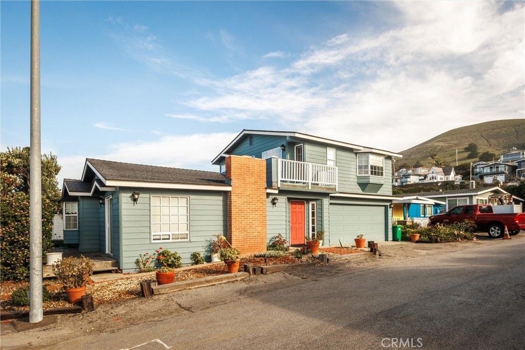 Directly across from the beach, this prime corner property captures ocean views from the upstairs deck and delivers classic Cayucos charm with standout curb appeal. Blue shiplap siding, crisp white trim, a brick chimney, and a bold red front door create a striking first impression. The spacious living room centers around a cozy brick fireplace, creating a warm and inviting gathering space. A pocket door opens to a formal dining room that easily doubles as an office or flex space. Upstairs, coastal views stretch toward Cayucos Point and Point Estero, best enjoyed from the upper deck. The home also offers an oversized two-car garage with laundry, exterior access from the laundry area, generous street parking, and smart storage beneath the stairway. Just steps from coastal access stairs and set on an easy-care parcel, this uniquely designed home is perfectly positioned to enjoy the best of beachside living.
