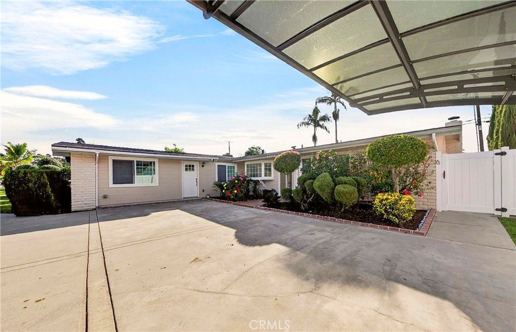 Discover this charming, well-maintained single-story family home situated in the prestigious Los Coyotes Golf Course neighborhood. The main house offers 3 bedrooms, 2 baths, 1560 sq ft, plus a professionally permitted ADU with 1 bedroom, 1 bath, 573 sq ft, totaling 4 bedrooms, 3 baths, and 2,133 square feet of living space. The main house was remodeled in 2025, including laminate flooring throughout, recessed lighting, fresh interior paint, and a new roof. The modern kitchen offers white cabinetry, quartz countertops, a stylish backsplash, and stainless steel appliances, complemented by a tankless water heater for energy-efficient hot water. The primary suite features mirrored closets and an updated master bathroom with a touch-sensor mirror. Two additional bedrooms also include mirrored closets. The fully remodeled hallway bathroom offers a double sink and touch-sensor mirror. The home is beautifully maintained with manicured landscaping. The flat, spacious backyard features an epoxy coated patio floor, a partial deck, new grass, a gazebo, and a large storage shed, perfect for outdoor activities and entertainment. The landscaped front yard with roses and palm trees includes a spacious driveway with a canopy for shaded parking. The garage has been converted into a fully permitted ADU featuring one bedroom, one bathroom, a walk-in closet, laminate flooring, a kitchen, and inside laundry. The ADU previously generated approximately $2,500 per month in rental income and can also serve as an in-law quarters, offering flexible living arrangements. Ideally located within the highly regarded Sunny Hills High School district and close to Los Coyotes golf course, shopping, markets, restaurants, banks, and Ralph B. Clark Regional Park. This home offers a rare combination of elegance, functionality, and a prime Buena Park location.