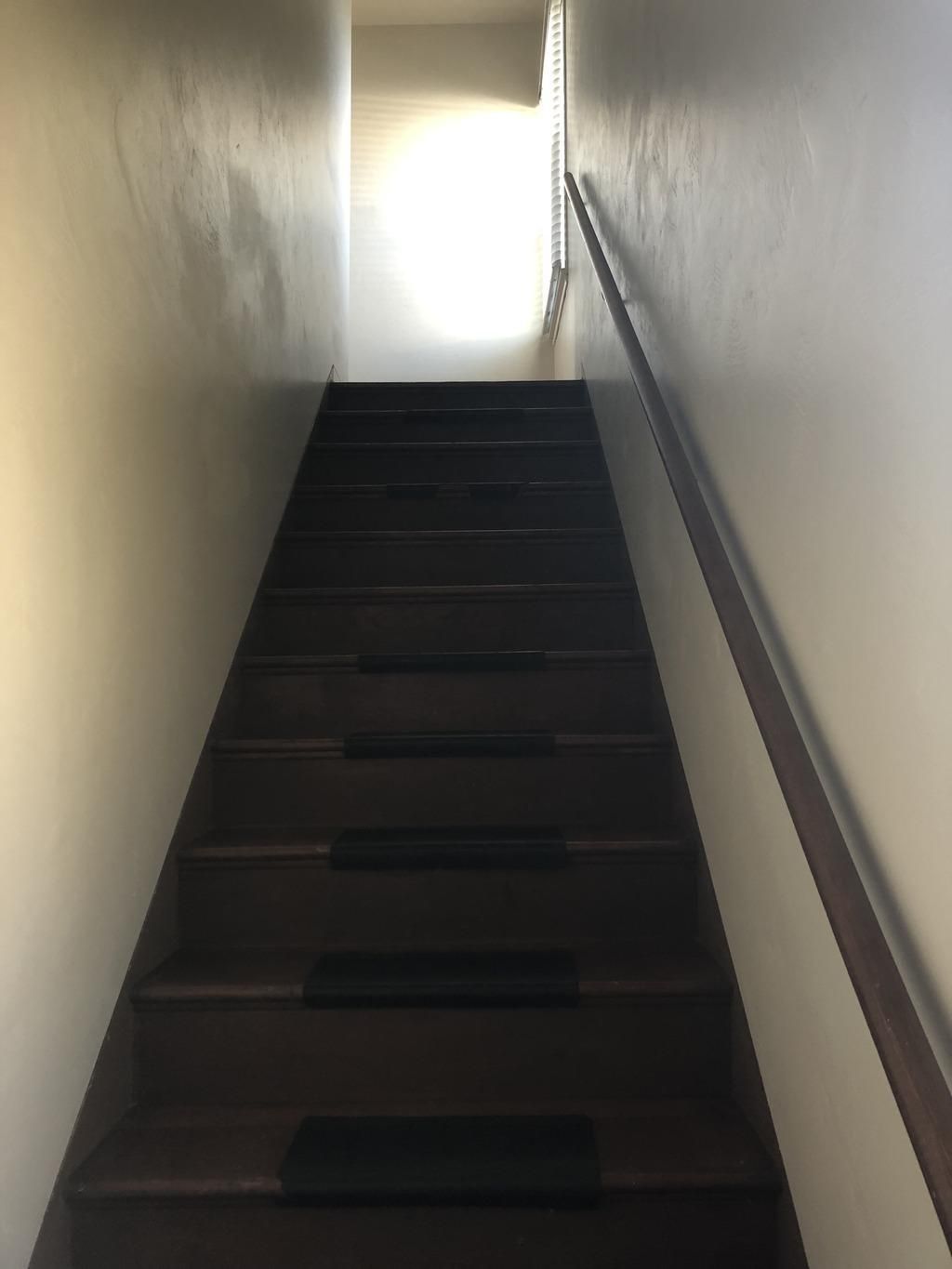 Upon entering, you are greeted by stairs leading up to the main living area.